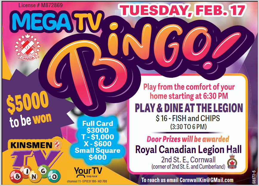 Cornwall Kinsmen TV Bingo is your weekly TV bingo hosted by the Kinsmen Club of Cornwall each Tuesday from 6:30 pm to 7:30 pm.